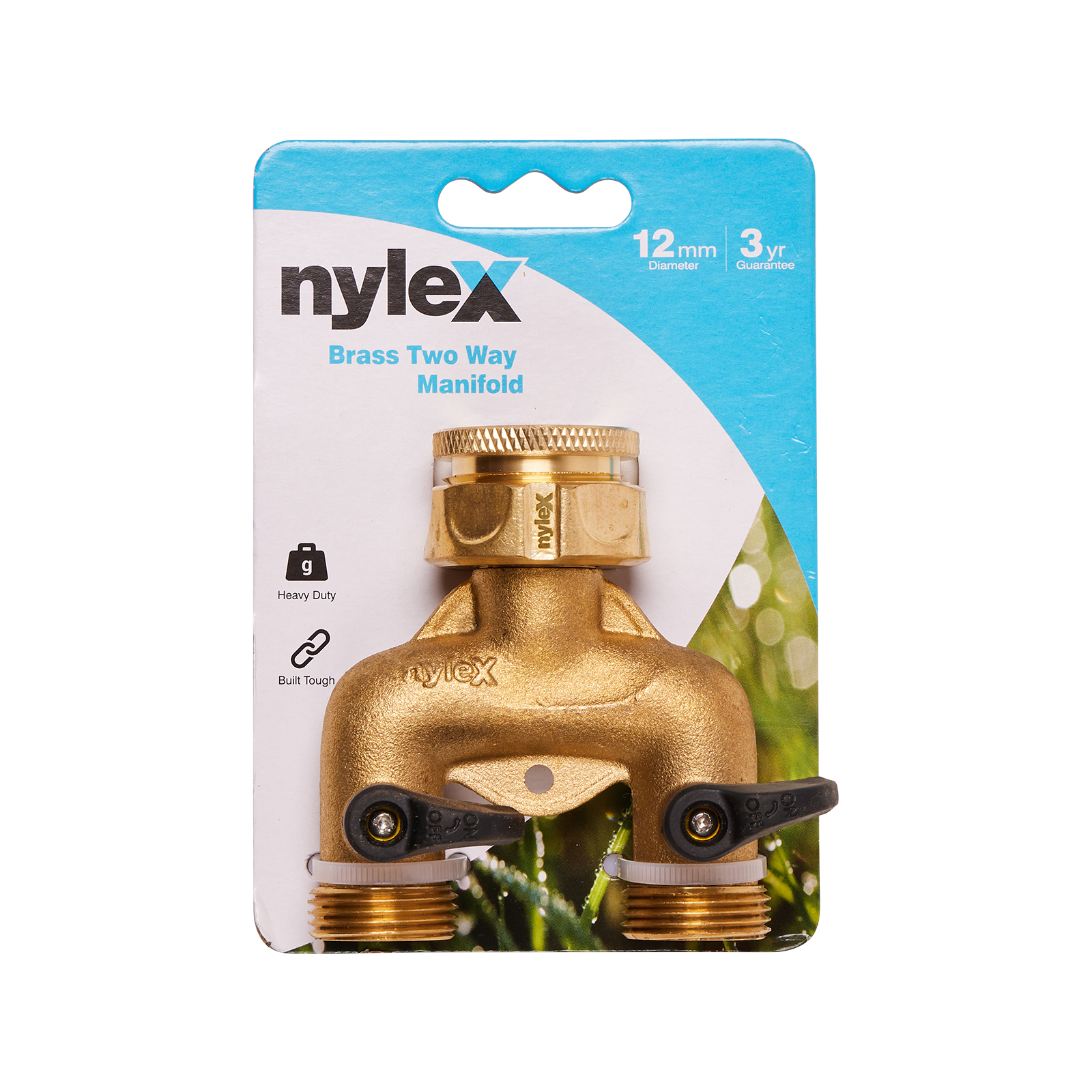 The Nylex Brass 2-way Manifold converts one tap into two, allowing you to use two hoses from the same tap.