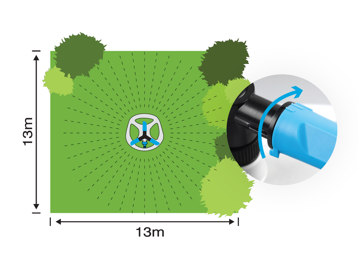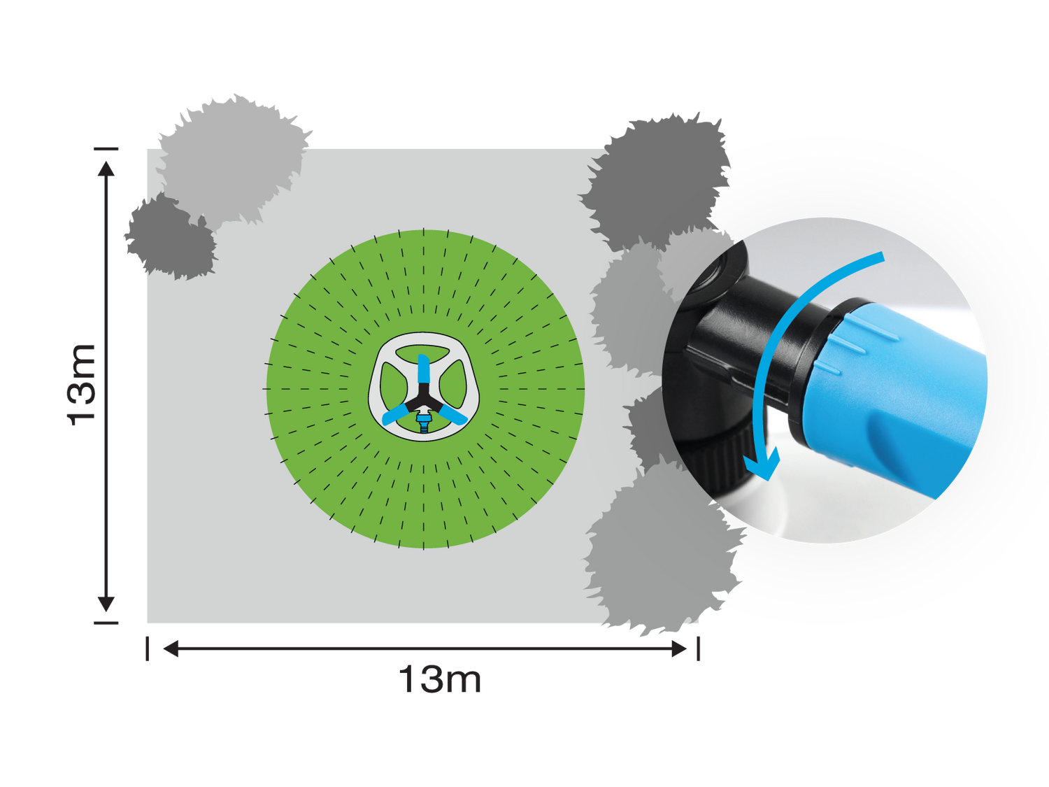 Looking for bigger reach? With a quick nozzle adjustment, the Nylex 3-Arm Base Sprinkler can cover up to 13 metres in diameter. Ideal for evenly watering medium-sized lawns and gardens with ease.