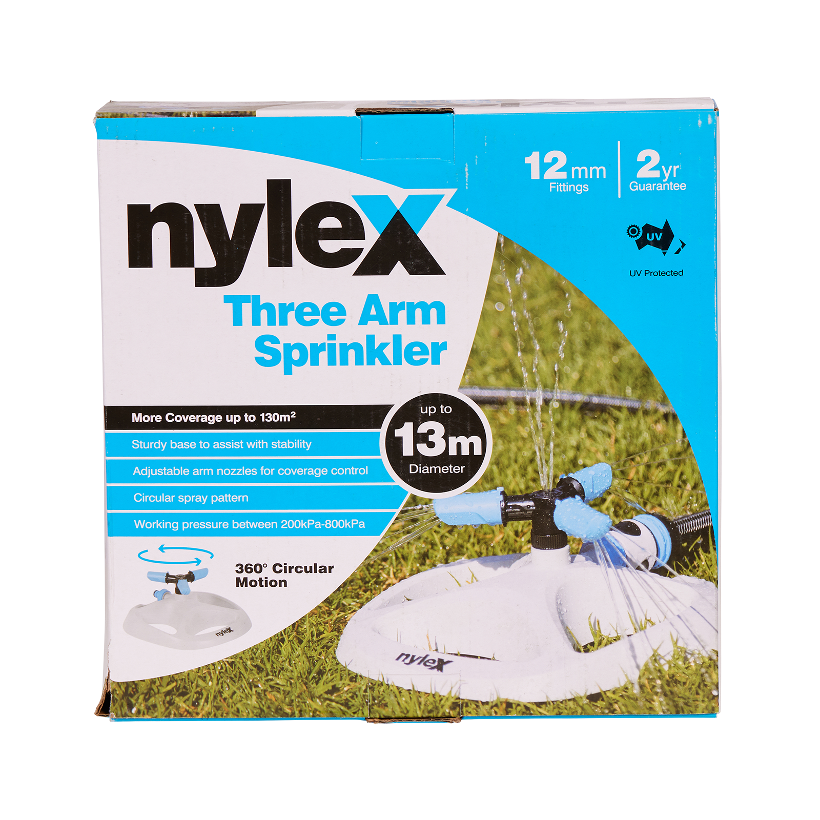 The Nylex 3-Arm Base Sprinkler connects to standard 12mm fittings and hoses and is built to suit small to medium-sized gardens.