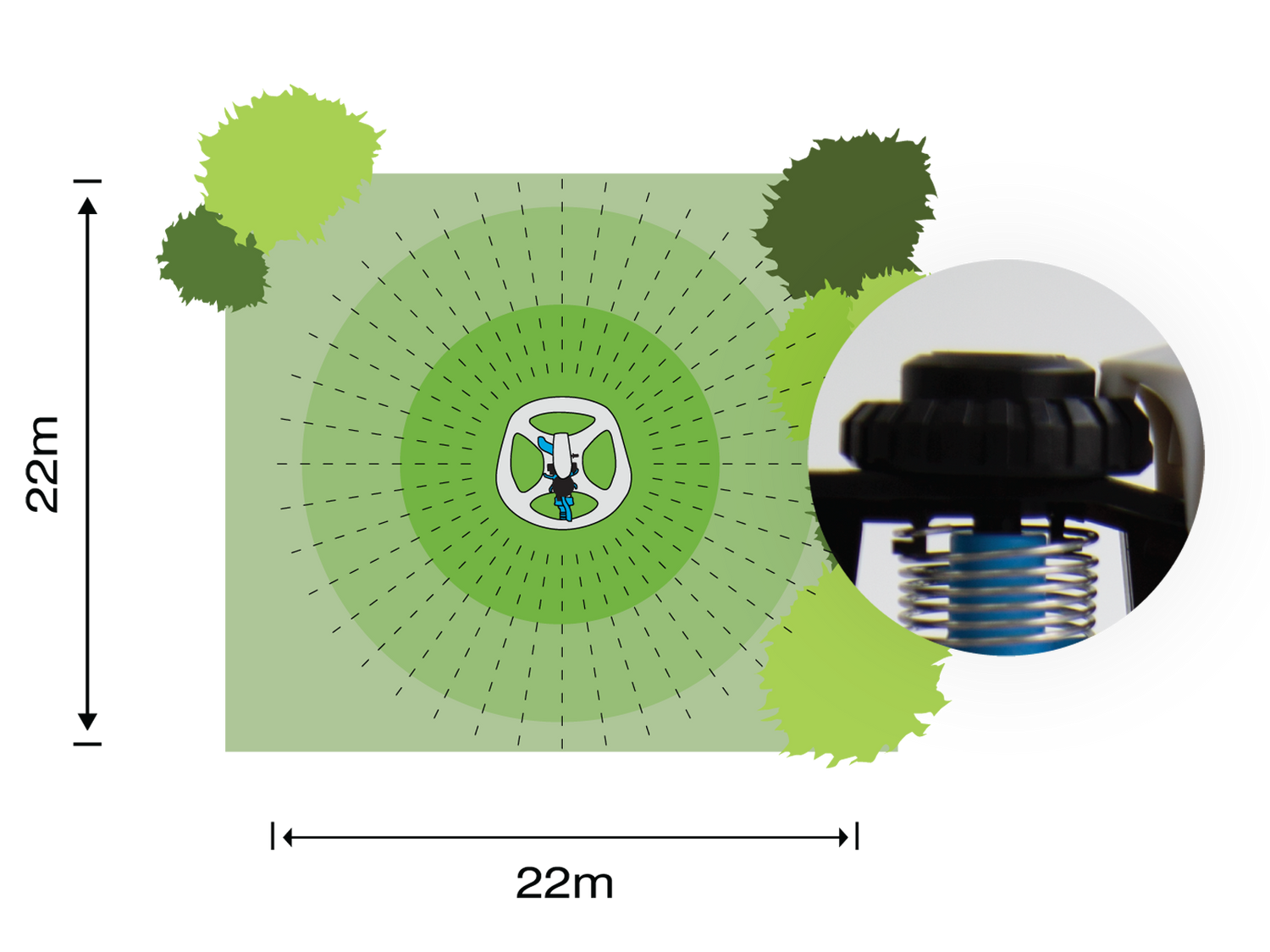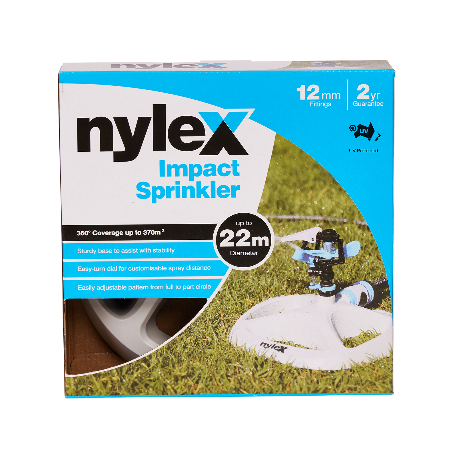watering control for efficient coverage and durability in every garden setting. Adjustable control patterns allow you to tailor the water distribution up to 22m to match your lawn's unique layout, promoting lush greenery with every rotation. Built to withstand the elements and engineered for reliability, the Impact Base Sprinkler is the perfect choice for maintaining vibrant landscapes effortlessly.