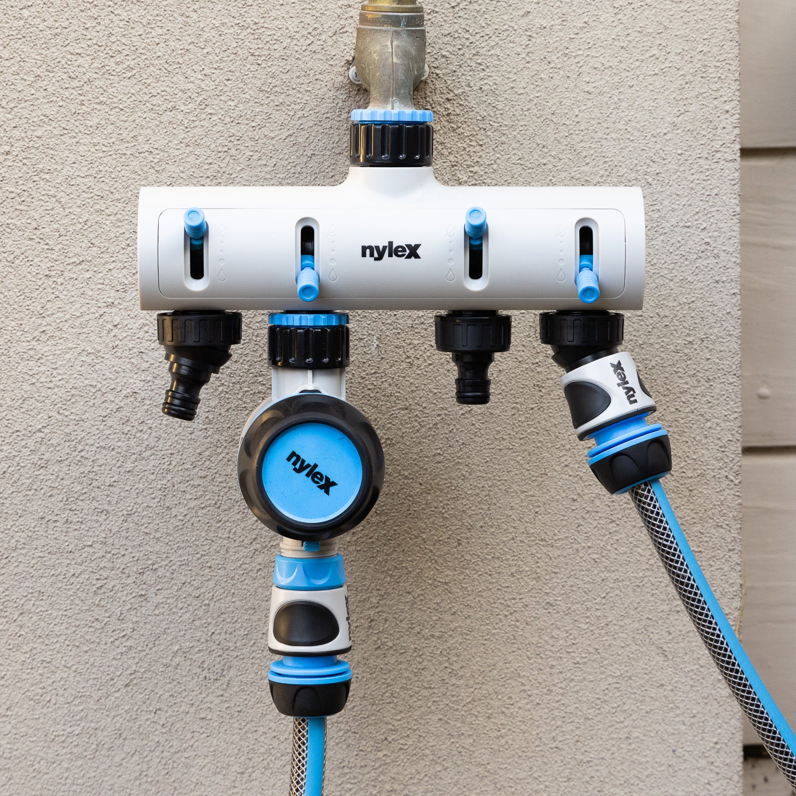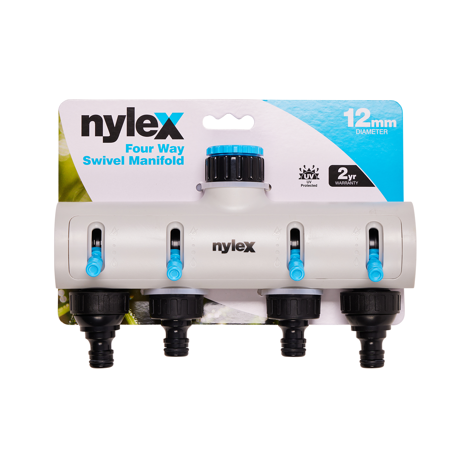 The Nylex 4-way Swivel Manifold converts one tap into a multifunctional watering area, allowing you to use four hoses from the same tap. This versatile unit allows you to run soaker or weeper hoses whilst still using your garden hose for the bigger watering jobs.