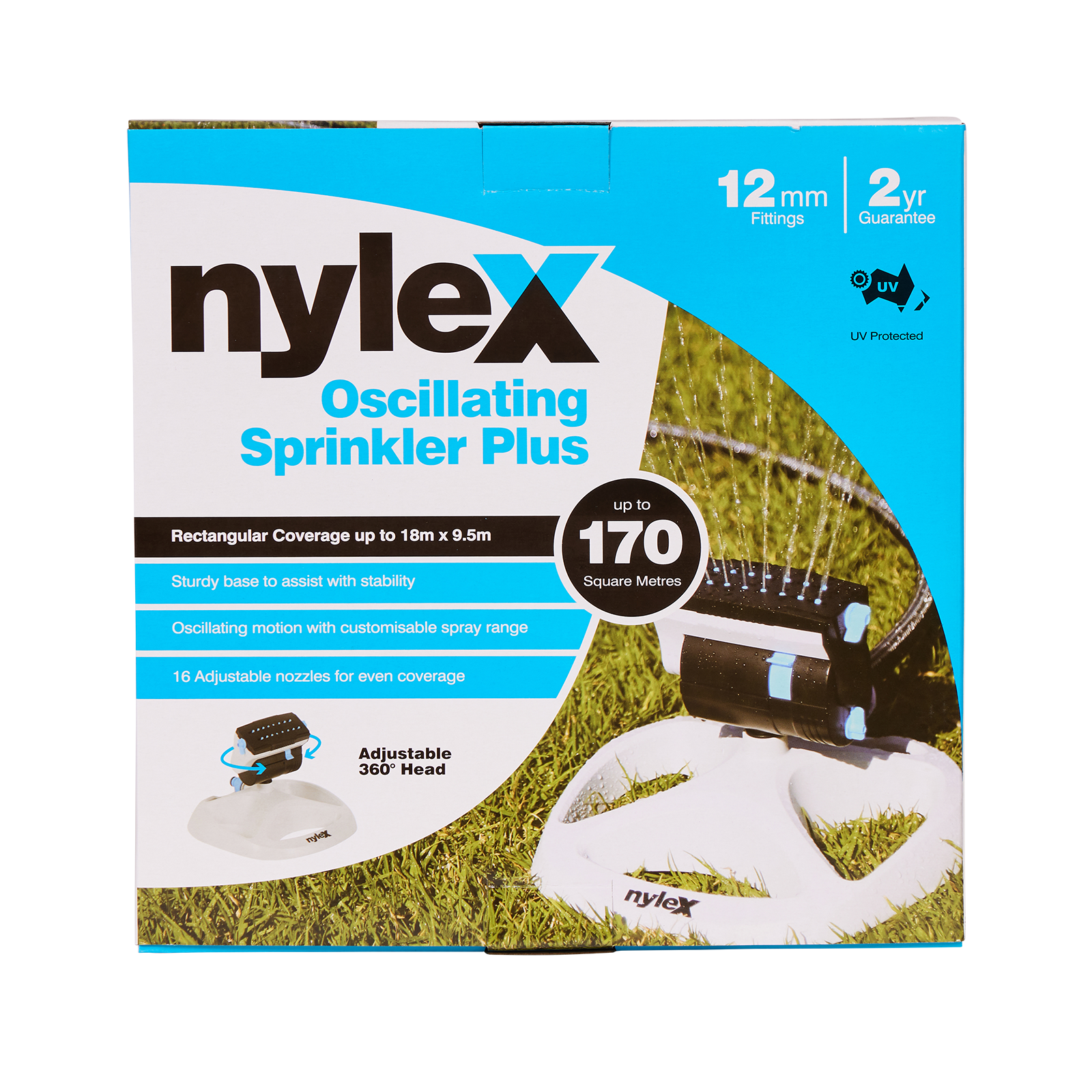 The Nylex Oscillating Sprinkler Plus offers a complete customisation of its watering pattern for medium to large lawns and gardens. To accommodate the large spray, the sprinkler is fitted with a sturdy base to provide additional stability.